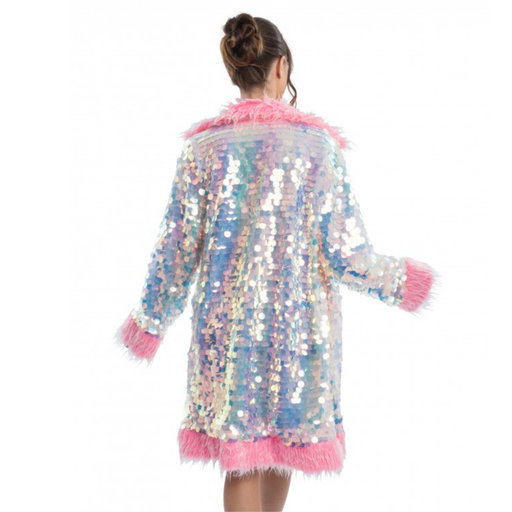Bezaubernder Mantel, vollständig mit großen irisierenden Pailletten verziert, die bei jeder Bewegung schillern. Rosa Fellstoff an Kragen und Säumen...
