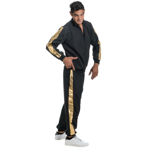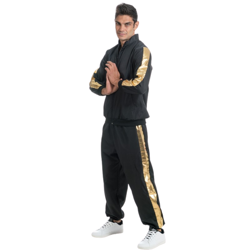 Edler schwarzer Trainingsanzug mit markanten goldenen Seitenstreifen an Hose und Jacke.Der Look erinnert an den klassischen Rapper-Style und strahl...