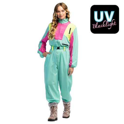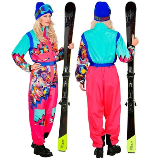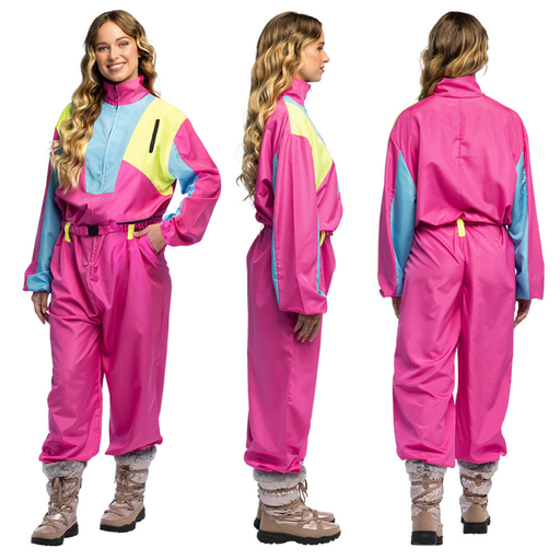 Reise mit diesem farbenfrohen, ikonischen Skianzug-Look zurück in die 80er- und 90er- Jahre! Die Kombination aus Pink, Blau und Gelb sorgt für eine...