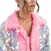 Bezaubernder Mantel, vollständig mit großen irisierenden Pailletten verziert, die bei jeder Bewegung schillern. Rosa Fellstoff an Kragen und Säumen trifft innen auf einen regenbogenfarbenen, glänzenden Stoff – wendbar und damit doppelt spektakulär.