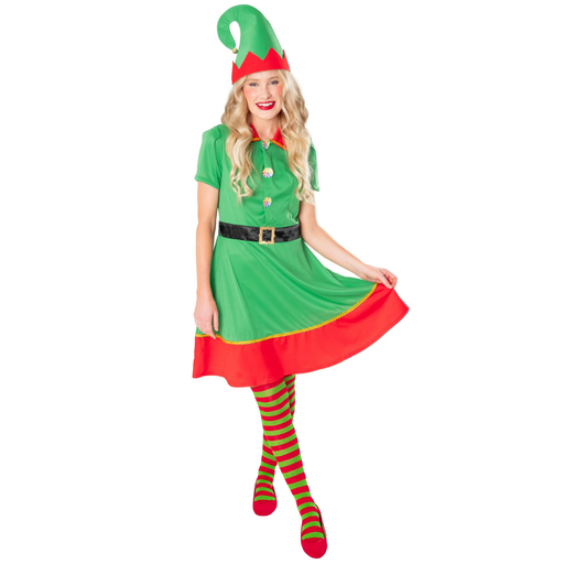 Tauche ein in eine märchenhafte Welt mit diesem liebevoll gestalteten Elfinnenkostüm für Erwachsene. Das grün-rote Kleidchen mit goldfarbenen Verzi...