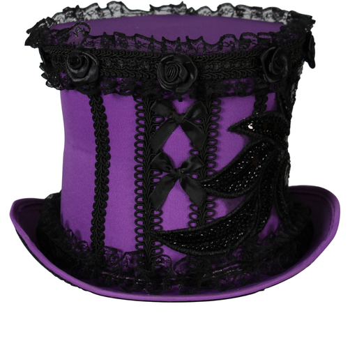 MaskeradeDieser auffällige lilafarbene Zylinder begeistert mit seinen aufwendig gearbeiteten schwarzen Spitzen- und Zierdetails. Rüschen, Stoffrosen und ver...