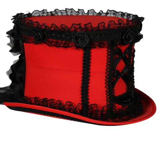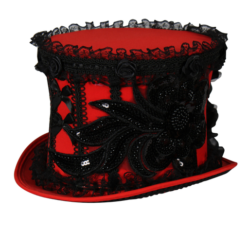 MaskeradeDieser auffällige rote Zylinder begeistert mit seinen aufwendig gearbeiteten schwarzen Spitzen- und Zierdetails. Rüschen, Stoffrosen und verspielte...