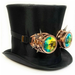Eleganter Steampunk-Zylinder in tiefem Schwarz, bezogen mit edel glänzendem Satin – ein absoluter Blickfang für jedes Kostüm. Die angebrachte irisierende Brille  verleiht dem Hut einen futuristischen Charakter im viktorianischen Stil. Perfekt für Steampunk-, Gothic- oder Fantasy-Outfits.