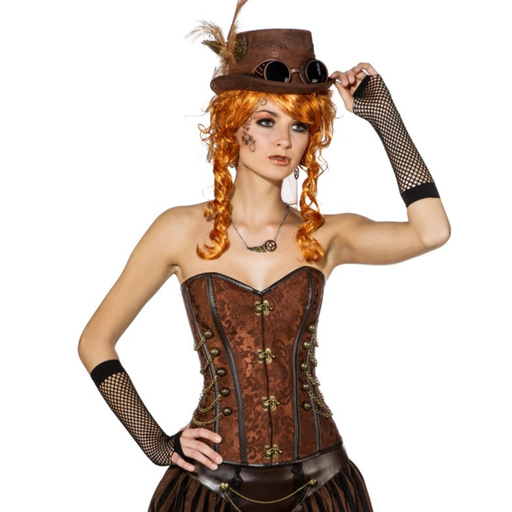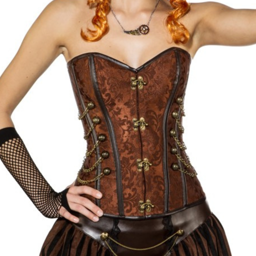 MaskeradeSteampunk-Corsage mit silbernen Häkchen Diese elegante braune Corsage mit silbernen Häkchen sowie dekorativen silbernen Knöpfen und Kettchen ist ei...